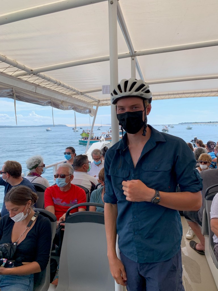 Williams first day on the road. We biked around 40 miles today. The first twenty was to a town called Cap Ferret where we took a ferry across a super clear blue bay to Arcachon. William really wanted to go to a French Cafe in Arcachon, but he was too picky so we had to go to the last place in town before we were back on bike trails and he got a cappuccino. But he loved his cappuccino.