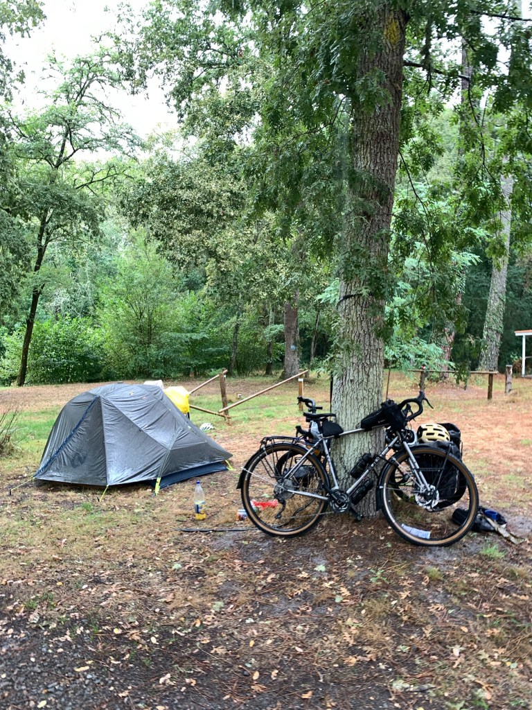 Between the ocean and the vineyards was a lot like biking through the American West. Lots of unpopulated but pretty areas with the occasional small town. We ended up in this little French town with a Carrefour grocery store and decided we’d camp there.