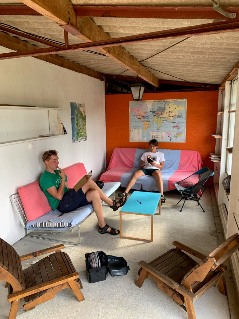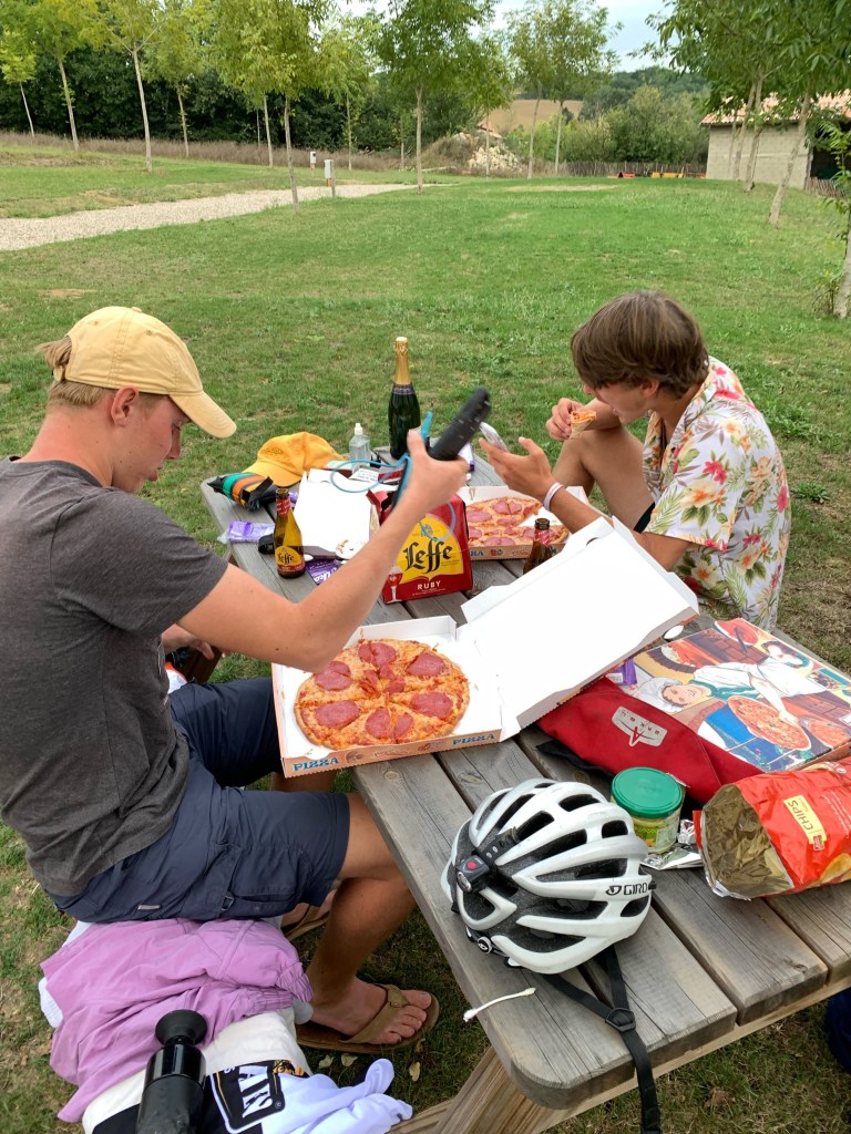 We got to the camp spot at 5. It was just the farm owner and his dog. He gave us the grand tour of the campground, the little shop, the hang out spot, the bathrooms and the pool. We bought a bottle of wine which he grew the grapes for and then we set up our tents and went to the hangout spot.