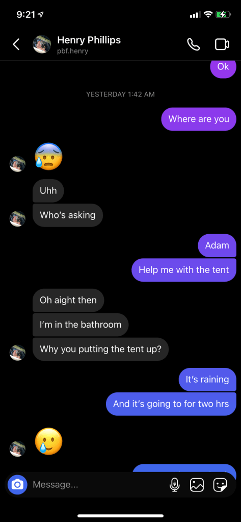 By the time Henry was back I had nearly set up the tent. Just the stakes left. But I realized we forgot to let our tent air out from the other rain night so the whole inside was wet.
