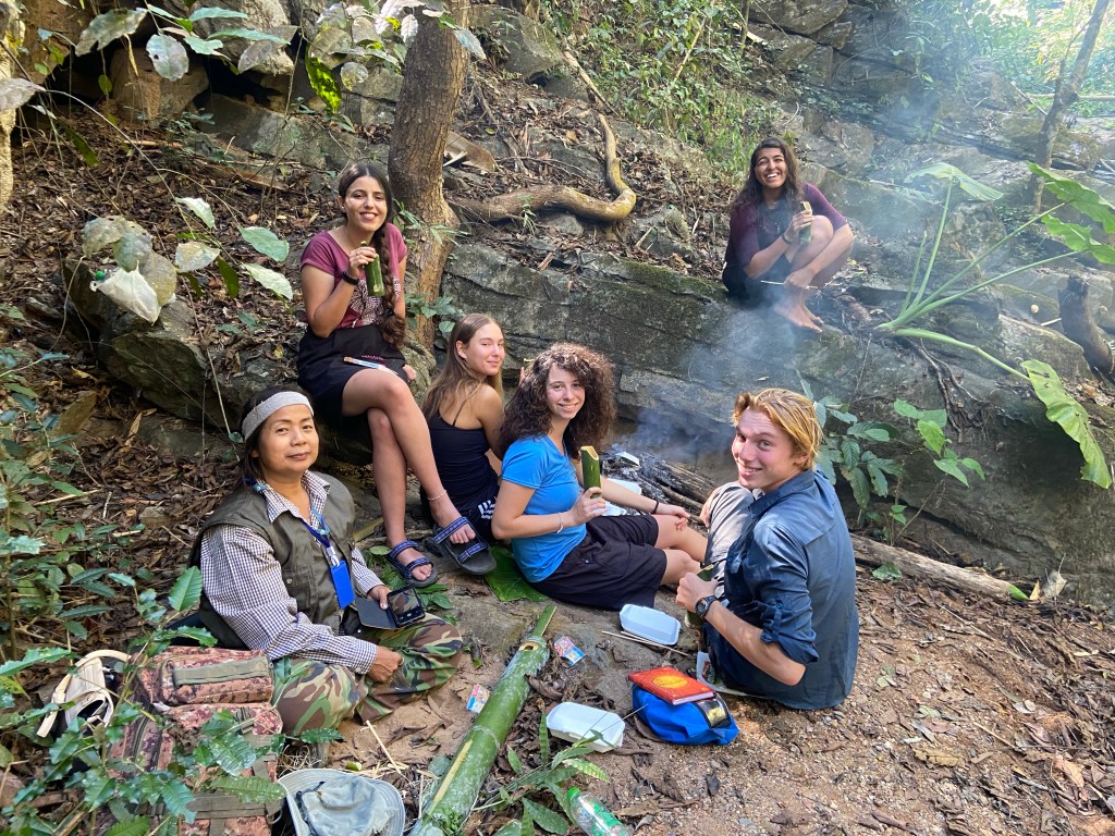 We stopped for lunch at a little waterfall. We swam as Che boiled tea over a fire in bamboo chutes and Chan heated up some Pad Thai’s. We are with chopsticks they carved and cups they cut from bamboo chutes.